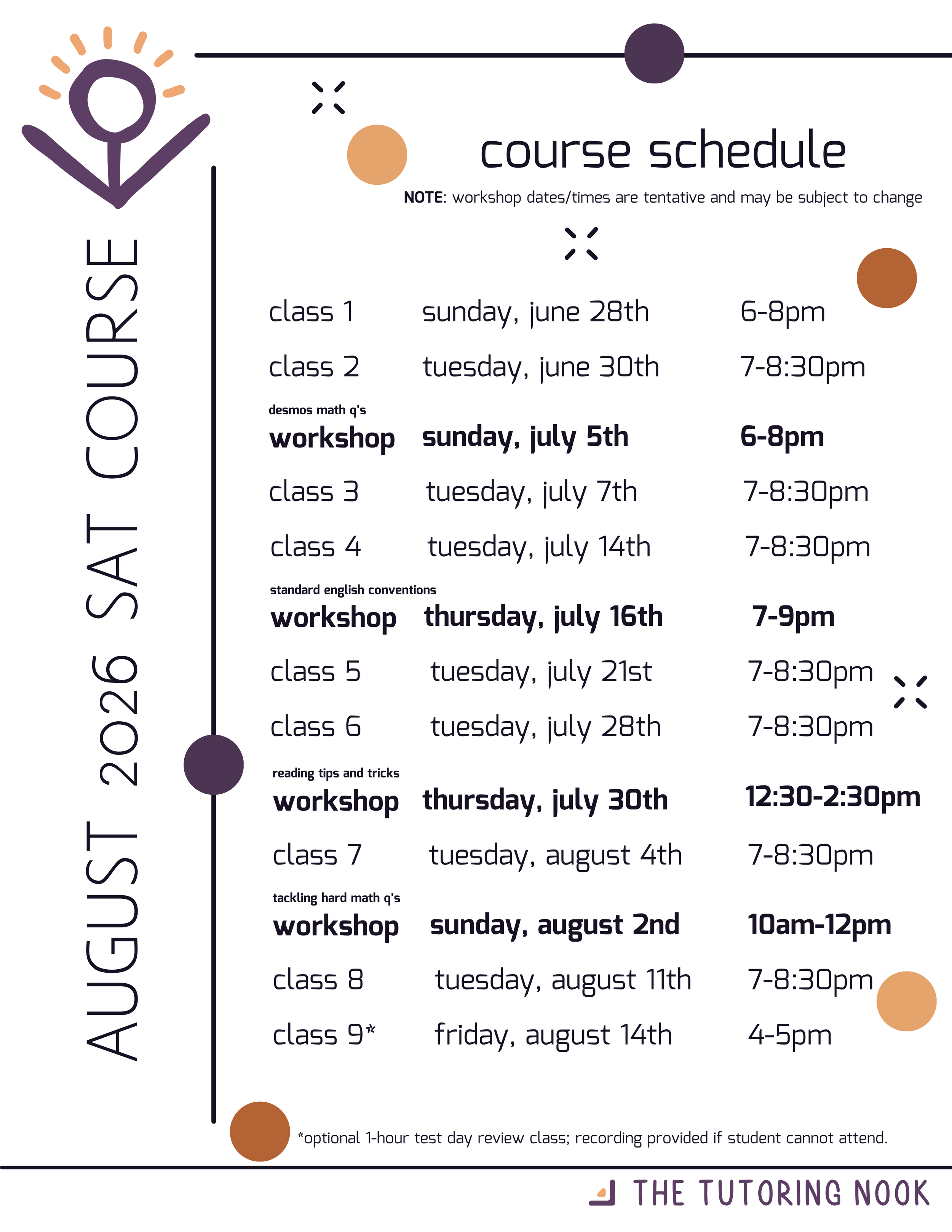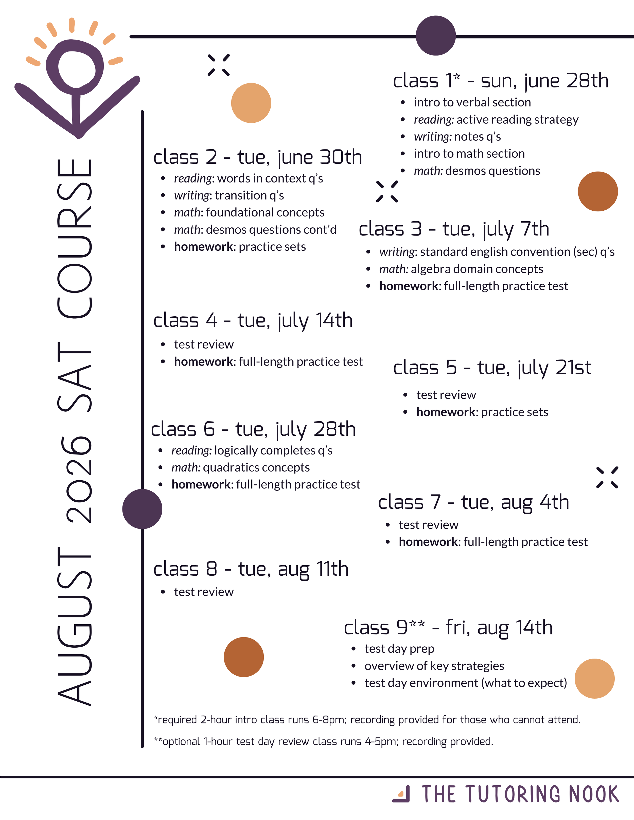 This course serves students preparing for the August SAT and September SAT. A group course student who plans to test in September will have the option to engage in private sessions (this is separate from the 1-2 private session add-on) after the prep course finishes. I am limited by how many private students I can take on for September SAT, so please note that there are only 4 seats in the course available for students testing in September who would like to continue on with private tutoring after the August course ends.